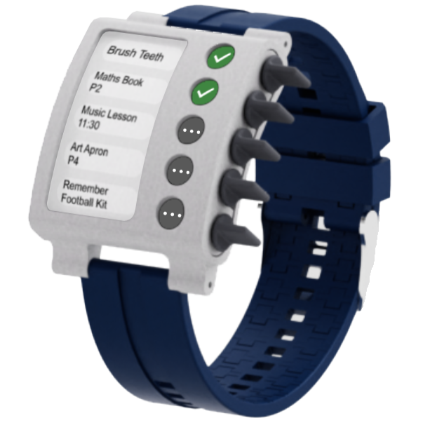 Nudge is a pocket-sized, wearable tool designed to help children and families manage daily routines without the stress of screens or complicated apps. With a clear e-ink display and tactile buttons, it provides gentle prompts that support planning, memory, and independence throughout the day.